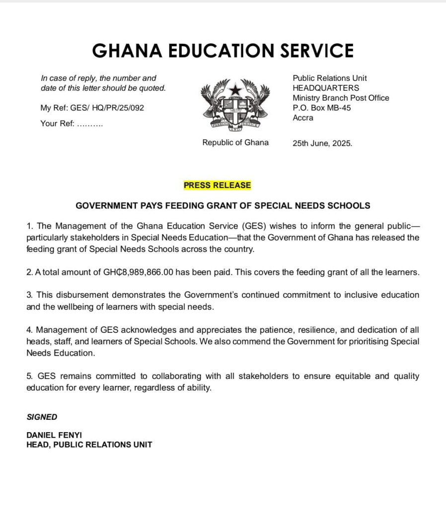 The disbursement was officially announced in a press release signed by Mr. Daniel Fenyi, Head of the Public Relations Unit of GES. The payment is meant to cover the feeding costs of all learners in special needs institutions across the country.