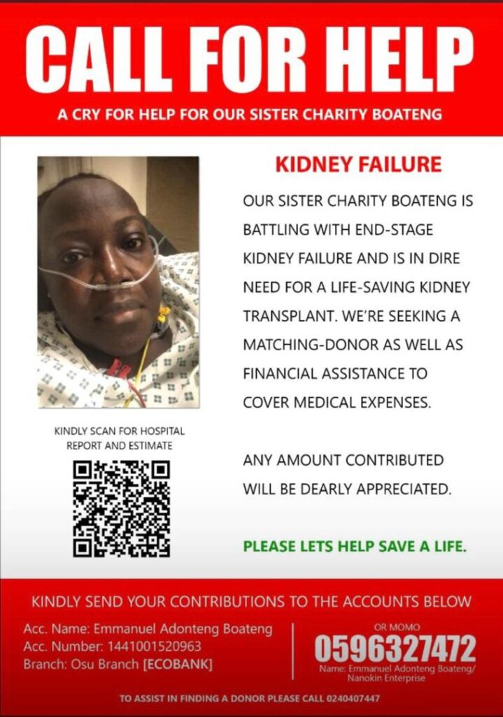 The family of Charity Boateng, a Ghanaian woman suffering from end-stage kidney failure, has made a heartfelt appeal to the public for financial assistance to support her life-saving treatment.
