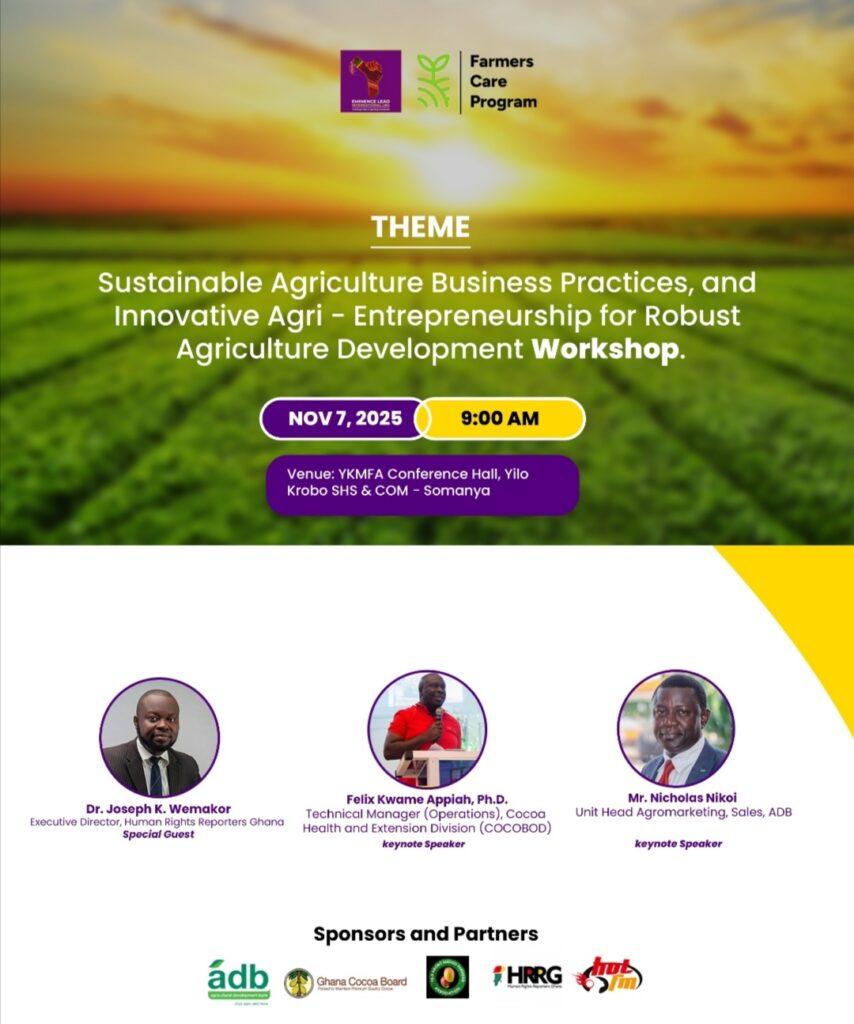 Eminence Lead International is set to host a transformative workshop for farmers under its flagship “Farmers Care Program” at the YKMFA Conference Hall, Yilo Krobo Senior High School, Somanya, on Friday, November 7, 2025, at 9:00 a.m.