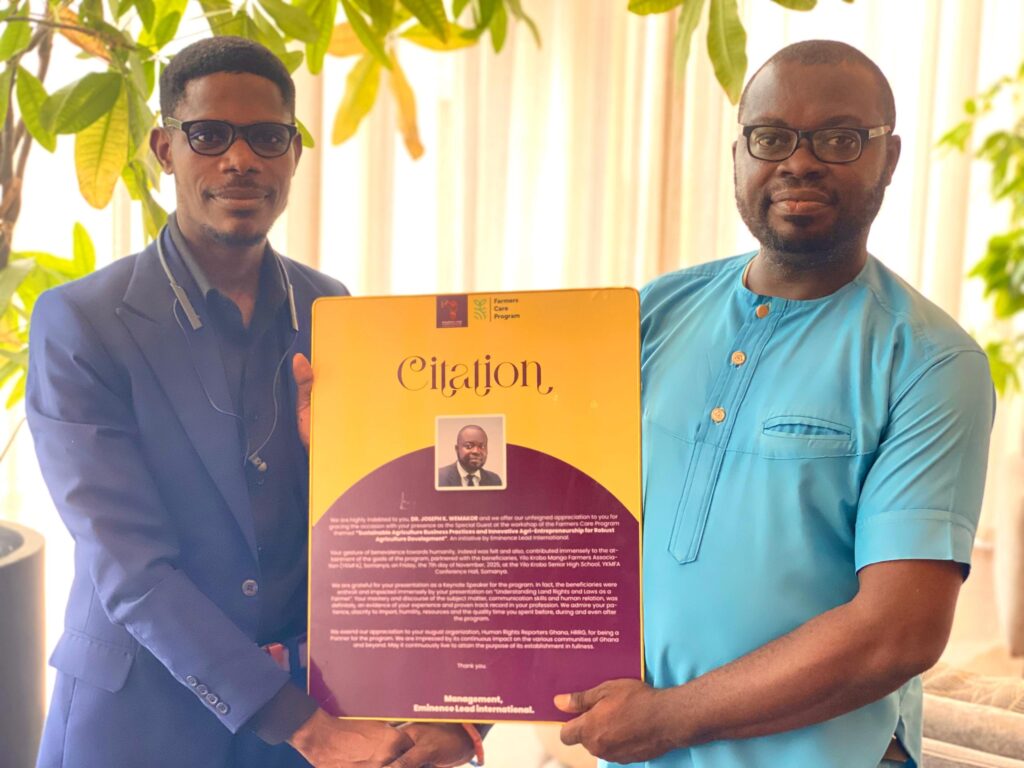 Eminence Lead International, a NGO, has presented a Citation of Honour to the Executive Director of Human Rights Reporters Ghana (HRRG), Dr. Joseph Kobla Wemakor, in recognition of his role as Special Guest of Honour and Keynote Speaker at the Farmers Care Programme.