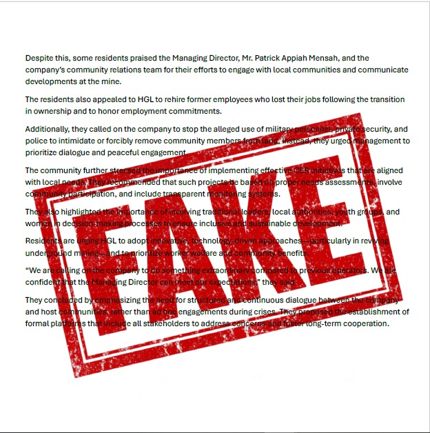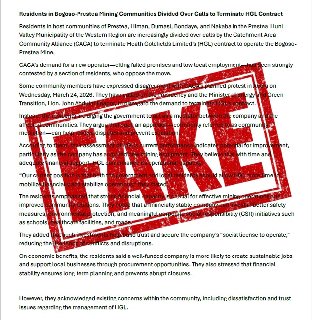 It is however not true that, residents in host communities of Prestea, Himan, Dumasi, Bondaye, and Nakaba in the Prestea-Huni Valley Municipality are increasingly divided over calls by CACA to terminate Heath Goldfields Limited’s (HGL) contract to operate the Bogoso-Prestea Mine.