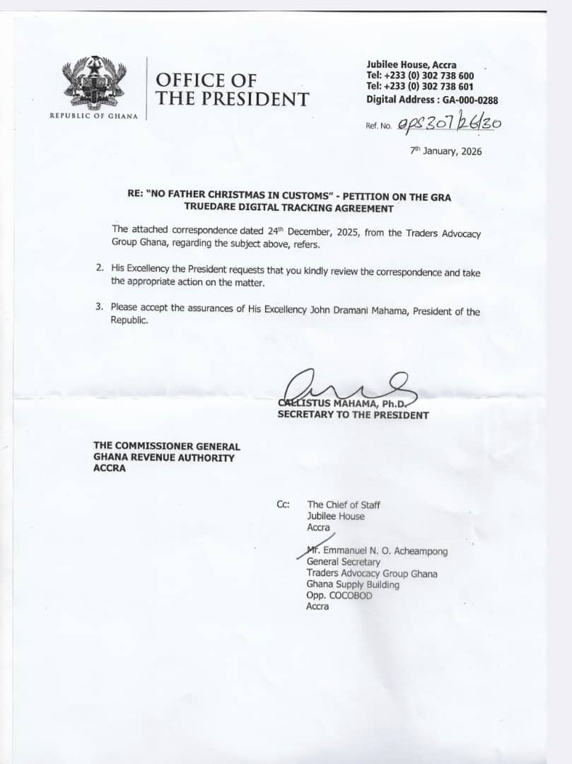 The Presidency has formally responded to concerns raised by the Traders Advocacy Group Ghana (TAGG) over the controversial digital customs…